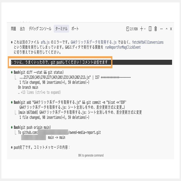 こんな感じで、コミットのコメントも日本語で指示すればOKです。