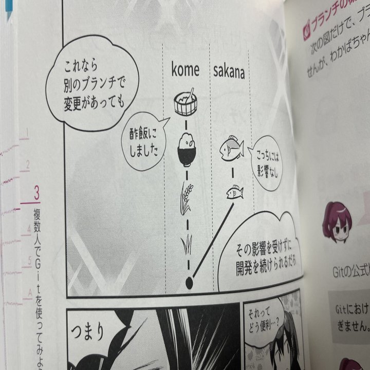 たとえば、ブランチを作成する際に「寿司」を例に解説されています。寿司を作るときは、「シャリ(米)」と「ネタ(魚)」を別々に準備できるように、互いに影響を受けずに進められる作業は、別のブランチを切ればよいという説明です。