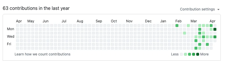 ちなみに、この本を読んだ甲斐もあり、3月から本格的に使い始めましたが、1か月半ほどで、63contributionsを達成しました!(すごいのかすごくないのかわからないが)